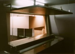 Die Eternitwand erfüllt ihrerseits zwei Aufgaben: Einerseits ist sie dynamisches Element, wegweisend - in den Veranstaltungsraum weiterleitend, andererseits ist sie Trennelement, das selbstbewusst aus dem Boden stößt, abgerückt von den Wänden und der Decke, und trennt, was ihr in den Weg kommt. (Neben der Bar auch die Lichtsegel an der Decke des Büros - beide scheinbar jäh abgeschnitten.)