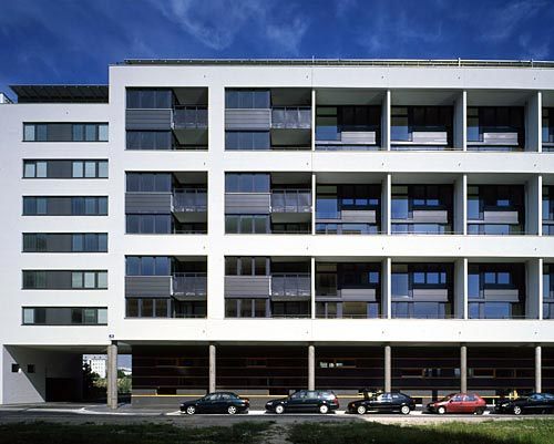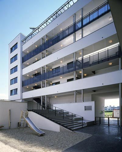 In Riegelmitte sind durchgesteckte Maisonetten mit hofseitigen Laubengängen an Eingangsflur und zweizeiliger Küche. Ihr Fensterband hat Ostsonne, keine Tür trennt vom großen Wohnraum mit Westloggia. Viel Höhe bietet ein Luftraum an der einläufigen Treppe in die obere Schlafebene mit Sanitärblock in der dunklen Mitte. Sowohl der große Raum im Westen als auch die zwei kleinen im Osten haben Balkon. Wie Passepartouts rahmen weiße Mauerbänder zartwandig getrennte Loggien an der Straße. Glas, Lochblech-Anthrazitbrüstungen und das Wechselspiel aus Balkon und Loggia geben der Fassade Plastizität. Die lichtmäßig schwierige 16-Meter-Tiefe wird zum Mehr an Privatfreiraum, der Ost-und Westsonne hereinlockt. An den Riegelenden liegt je ein Dreispänner ums verglaste Stiegenhaus, das gelenksartig die Seitentrakte anbindet. Wie eine Brücke schwebt ein schmaler Appendix im Norden über die Straße, dockt als gedeckte Arkadenverlängerung an Elsa Prochazkas Nachbarbau an. Die Garage führt im Erdgeschoss zum Sondertyp: Man wohnt im ersten Stock mit Südterrasse zum Hof, das Galerienordlicht erhellt das hohe Entree. Das variierte Motiv des Mauerrahmens um Glas- Anthrazit-und Metallbänder eint die differenziert gegliederte Anlage.