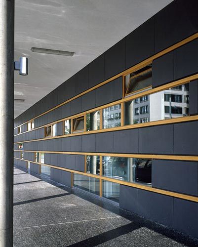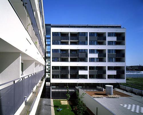 In Kagran gelang den Architekten Ablinger, Vedral & Partner ein locker wirkender Wohnbau der GSG mit hoher Dichte. Eine gehsteigüberragende Arkadenzone, luftige Laubengangbrücken, verglaste Stiegenhäuser und ein niederer, zarter Südtrakt gliedern die Baumassen. Dachterrasse, Ecklokal, Kinderspielraum und das begrünte Garagendach im Hof sorgen für Gemeinschaftsleben, Loggien und Balkone für privaten Freiraum.