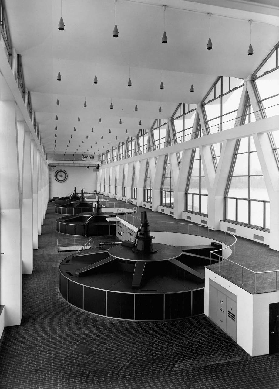 Und tatsächlich ist die Maschinenhalle des Kraftwerks alles andere als nüchtern und kalt. Ebenso expressiv wie leicht ruht das gefaltete Dach auf zwei Reihen Y-förmiger kannelierter Stützen, die sowohl die längs auftretenden Windlasten als auch die enormen Schublasten der Kranbahn aufnehmen, mit der bei Revisionen die vier je 140 Tonnen schweren Turbinen bewegt werden. Er habe sich bei der Turbinenhalle auf die notwendigen Bauelemente „Stützen, Kranbahn und Dach“ beschränkt, so der Architekt - in der Ansicht vom Fluss aus wird die Filigranität der Hallenhülle im Vergleich zur massiven Turbinenwelt darunter deutlich. Nachts schwebt das Gebäude als gleißender Lichtkörper über dem Wasser, dank der sechzig kleinen Punkt-Hängeleuchten und der indirekten Beleuchtung der Decke.
