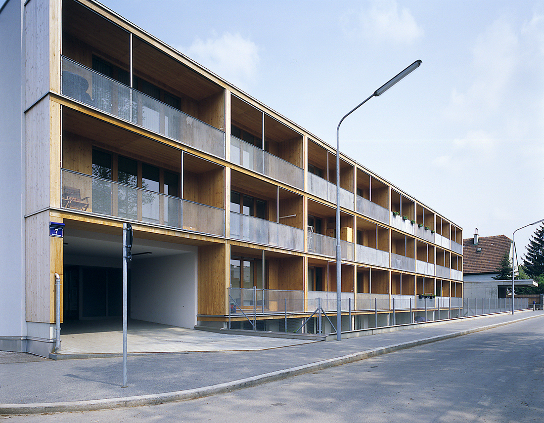 Als erster teilweise viergeschossiger Holzwohnbau (in Brettsperrholz) auf einem massiven Sockelgeschoss in Wien besticht das Projekt besonders durch seinen mutigen und pionierhaften Ansatz. Mit großem Einsatz von Seiten der Planer wurden sowohl Bauherr als auch Gemeinde von der Machbarkeit eines Holzgeschosswohnbaus im Rahmen der gesetzlichen Vorgaben überzeugt. Hervorzuheben sind außerdem der interdisziplinäre Zugang in der Projektentwicklung und die wesentliche konstruktive Verwendung von Holz. Die Jury ist überzeugt von der Bedeutung der Wohnanlage als Vorreiter und Wegbereiter für zukünftige Projekte ähnlicher Größenordnung in Holzbauweise im städtischen Bereich und davon, dass diese Erfahrung dazu beitragen wird, dass die eine oder andere vom Bauherrn in diesem Fall recht eng gesetzte Rahmenbedingung in Zukunft großzügiger ausgelegt wird. (Jurytext wienwood 05)