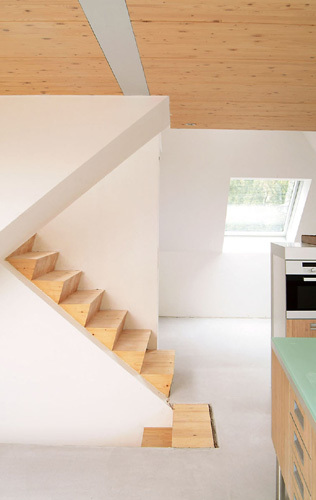 Durch einen großflächig verglasten Anbau mit anliegender Terrasse wurde auch die verwinkelte Tiefparterrewohnung zum südseitigen Garten hin geöffnet und konnte zu einer überraschend licht- und sonnendurchströmten Wohnung umgewandelt werden. Die Einheit darüber profitiert durch das als Terrasse mit Garten ausgebildete Dach des Anbaues. (Text des Architekten)