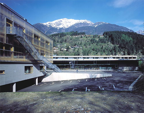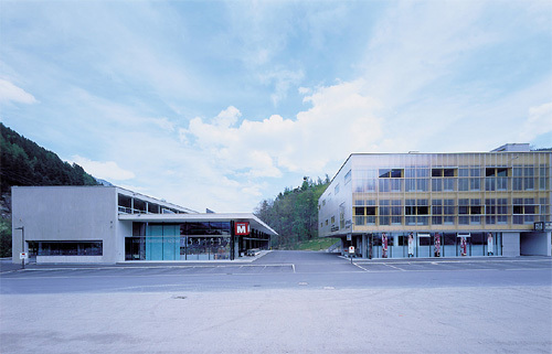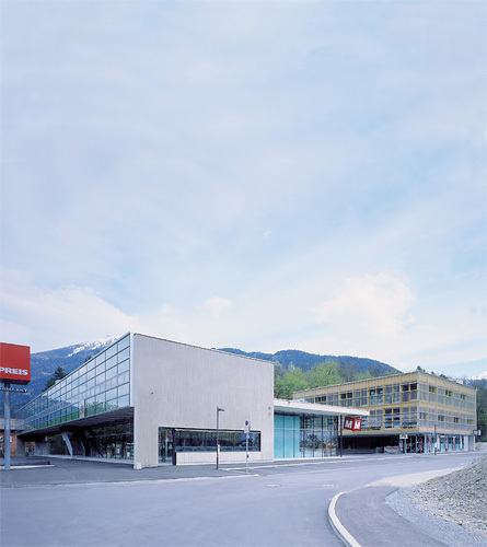 Die transluzente Hülle des Pavillons macht die Bewegung, die im Innenraum stattfindet, im Außenraum sichtbar. Durch den Niveauunterschied wird die Parkfläche, die zwischen den beiden Baukörpern liegt, von der anfangs ebenen Laderampe des Lebensmittelmarktes zur als Parkfläche genutzten Rampe im Untergeschoss des Pavillons.Die strassenseitige Auskragung im Obergeschoss des Lebensmittelmarktes beinhaltet Büroräumlichkeiten und verstärkt das lineare Erscheinungsbild des Baukörpers. (Text des Architekten)