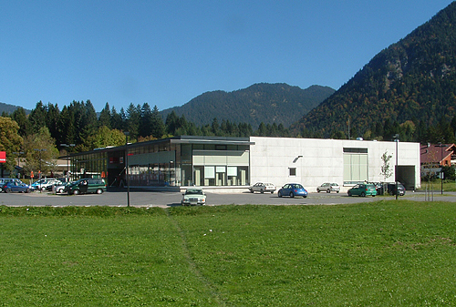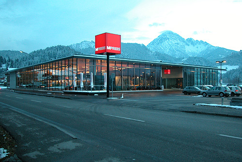 Zwei Bauteile mit einer trennenden Feuermauer und einem dazwischenliegenden Zugangs-Innenhof nehmen mehrere Funktionen auf: Den Lebensmittelmarkt MPREIS mit dem Baguette-Café, einen Drogeriemarkt und ein Blumengeschäft. Eine Dachplatte bindet die Funktionen und die Grundstücke zusammen, aus der der Zugangs-Innenhof herausgeschnitten ist.