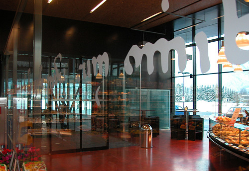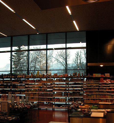 Zur Sonne hin ist der Baukörper fast gänzlich geschlossen und bietet die für einen Lebensmittelmarkt notwendige Beschattung. Zur Straße und zum Parkplatz – und damit zum Ort hin – ist die Raumbegrenzung mittels durchgehender Glasfassaden aufgelöst. Der große, hohe Innenraum ist von der Straße aus einsehbar und vermittelt so die Stimmung eines „Marktplatzes am Stadtrand“. (Claudia Wedekind nach einem Text des Architekten)