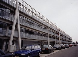 Der Eindruck, den der Wohnbau von Helmut Richter auf den ersten Blick vermittelt, ist der von Länge und Tempo – das Haus „pfeift “unglaublich sympathisch dahin –,und er löst ein, was man an Ansprüchen in dieser Lage anmelden muß. Man betritt die Wohnungen von Norden, Stiegenhäuser und Lift sind durch eine leuchtend rote Kunststoffplane – wie im ersten „Kiang “von Richter – ausgewiesen, sie sorgen für eine Rhythmisierung des langen Riegels.