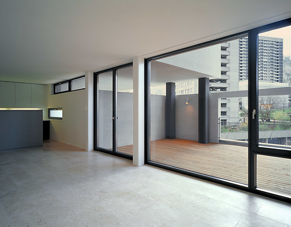 Hier geht es um Mietwohnungsbau, um das Zürcher Programm 10000 Wohnungen in 10 Jahren, sprich um einen Beitrag an die Verbesserung des Steuersubstrats. Darum tönt Patio zwar gut, doch Balkon ist genauer. Man ist Zeuge der Erfindung des Wohnungsgrundrisses aus dem Geiste des Balkons. Was braucht es, fragten sich zu Beginn die Architekten. Sie haben auf einem leeren Parkplatz Balkon gespielt und abgemessen. Sie sind auf rund 24 m² Nutzfläche gekommen. Der brauchbare Balkon erfordert eine genügende Tiefe (3,80 m), was zu einer übermässigen Beschattung der dahinter liegenden Räume führt. Allerdings: Setzt man nur vor jedes zweite Geschoss einen Balkon ein, so ist genug Licht da. Das führte zur Versetzung in der Fassade. Die Folge: Der Balkon wird in zwei Zonen geteilt, in eine eingeschossige geschützte Nische und in eine zweigeschossige Halle mit Aussichtsrahmen. Betrachtet man den Wohnungsbau der letzten dreissig Jahre, so ist eine Entwicklung überdeutlich: Der private Aussenraum wuchs ständig und gewann markant an Bedeutung. Dieser neue Balkontyp ist eine echte Erfindung, die diese Entwicklung qualitativ einen markanten Schritt weiterbringt: Der Balkon wird zum doppelhohen Aussenzimmer.