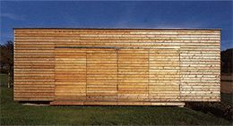 Unterschiedlich wurden Innen- und Außenseiten behandelt: außen roh, unbehandeltes Lärchenholz, Licht und Witterung ausgesetzt, und somit bald sich verfärbend, wurde im Inneren die edlere Variante gewählt: die Lärchenholzbretter sind hier gehobelt und geölt. Innen, an den Schmalseiten wurde ein Nebenraum integriert, der eine kleine Küche und Lagerfläche beinhaltet.