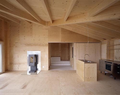 Vom Boden, aus dem die frei stehende Küchenzeile zu sprossen scheint, bis zur Decke ist alles mit Pappelsperrholz verkleidet und verströmt so eine ruhig-warme Behaglichkeit, vor der sich die grüne Pracht unterm weiten Himmel voll entfalten kann. Mit seinem lauschigen Leseeck unterm Diagonalsparren und der offenen Mitte am Panoramaglas wird dieser Wohnraum allein nicht zu groß, zu mehrt nicht zu klein.