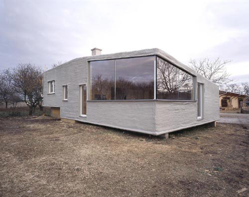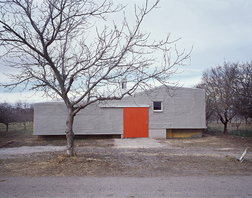 Die PPAG Architekten entwarfen eine Behausung, die wie ein friedlich schlummerndes Wesen leicht schwebend zwischen Obstbäumen ruht. Der Straße zeigt es seine graue Kehrseite, die mit gut dämmendem Zweikomponentenschaum bespritzt ist und in ihrer unregelmäßigen Struktur an gerunzelte Elefantenhaut erinnert. Wie ein Auge blinzelt das WC-Fenster aus der Fassade, unmissverständlich signalisiert die rote Schiebetür: offen oder zu.