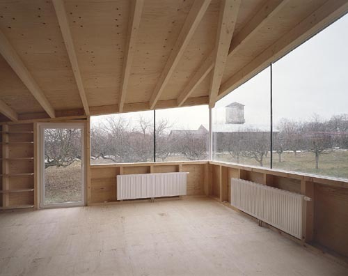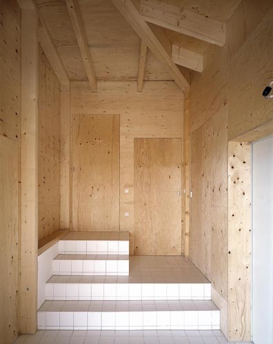 An der Rampe in den höhlenartig grauen Vorbereich dahinter wird man schlammige Stiefel los, an der Schnittstelle aller Lebensbereiche tritt man ins Haus. Durch die Wohnraumschiebetür winkt der Garten, gegenüber das weißgekachelte Bad. Gleichsam als Mini-Arena für private Auf-und Abtritte führen differenziert gestaltete Stufen zu Schlafzimmer und Studio, wo durch große Fensterscheiben die Baumkronen schwingen und in Augenhöhe Pferde vorüberziehen. Souverän hebt sich die aufgeständerte Fundamentplatte über Schlamm und Kleingetier hinweg, um mit einem Niveausprung die private Wohnzone der ersten morgensonnenbeschienenen Baumreihe entgegenwachsen zu lassen.