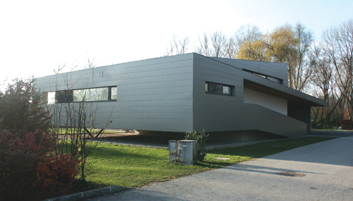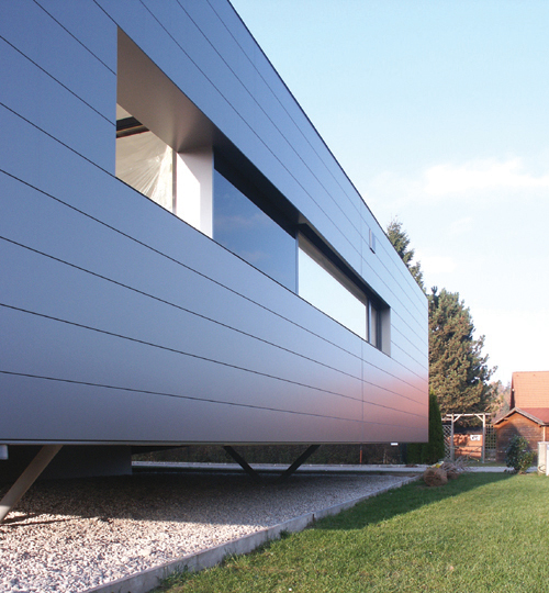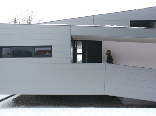 Das Konzept des Splitlevels wird nach außen über zwei sich verbindenden Pultdächer gezeigt, deren Neigungen und Verläufe dem inneren Ablauf folgen.