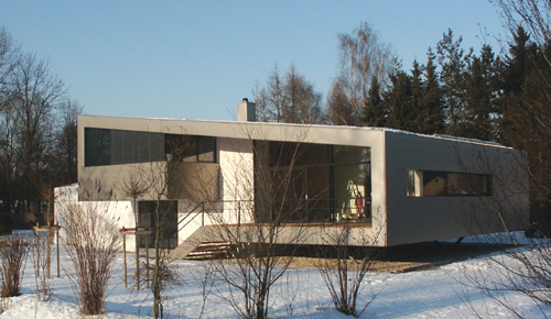 Vom Carport gelangt man gedeckt und behindertengerecht über die Zugangsrampe in den aufgeständerten Wohnbereich.