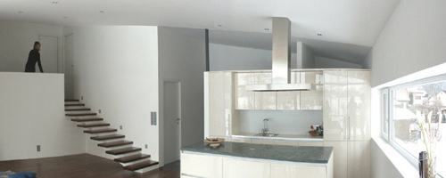 Ein Halbgeschoß höher werden die Schlafräume über die offene Arbeitsgalerie erschlossen.