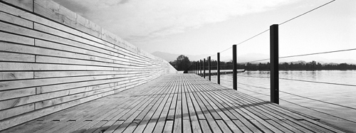 Der Raum über dem Zürichsee ist weit. Ungewohnt weit in dem stark hügeligen, von Gletschern und Flüssen modellierten und von den Menschen dicht überbauten Gebiet zwischen Alpen und Jura, dem schweizerischen »Mittelland«. Nur die Seen bieten sich darin als offene, ebene Räume an. Der seit einigen Jahren bestehende Holzsteg zwischen der Stadt Rapperswil und dem ehemaligen Fischerdorf Hurden verbindet daher nicht nur zwei gegenüberliegende Ufer, sondern führt hinaus in diese besondere Weite zwischen Wasser und Himmel. Gewiss kann sich der Mensch mit einem Boot ebenfalls in diesen Raum hinaus begeben, aber das ist nicht dasselbe wie zu Fuß, etwa einen Meter über der Wasserfläche auf einem 2,40 Meter breiten Weg dahin zu gehen, zu schlendern oder zügig zu wandern, wie es gerade gefällt. Ganze 841 Meter ist er lang, der Steg, und fünf Mal ändert er mit einem Knick mehr oder weniger stark die Richtung, ohne aber das Ziel, eine Landzunge auf der anderen Seeseite, aus dem Blickfeld zu lassen.