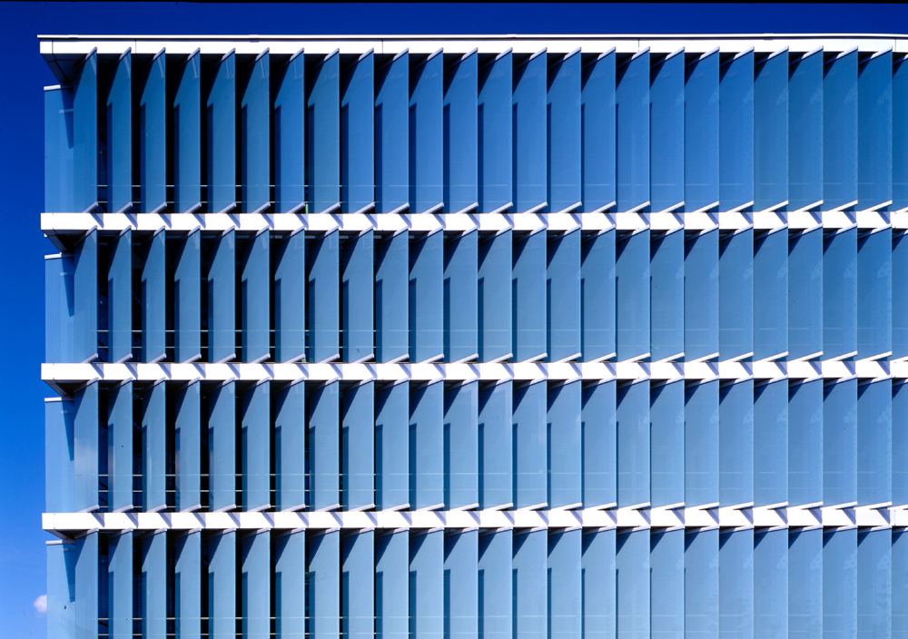 Als Wasserforschungsinstitut des ETH-Bereichs hatte die Eawag hohe Nachhaltigkeits-Ansprüche an ihr neues Verwaltungs- und Forschungsgebäude in Dübendorf. Der Architekt Bob Gysin und sein Team haben dem Institut ein Hightech-Ökohaus für 120 Arbeitsplätze gebaut, das keinen Birkenstock-Sandalen-Duft verströmt. Der rundherum mit stramm ausgerichteten blauen Glaslamellen eingefasste Bau liegt am Rand des Hallenensembles der Empa im Niemandsland zwischen Auto-, S-Bahn und Möbelhäusern. Die bedruckten Gläser sind zwischen die Fluchtbalkone eingespannt. Im Winter stehen sie offen, sodass das Haus passiv die Strahlungsenergie nutzen kann, im Sommer sind sie geschlossen und werden zu Schattenspendern.