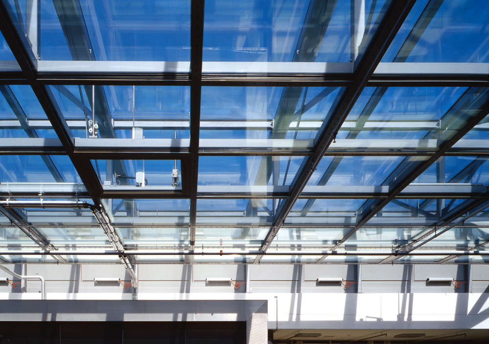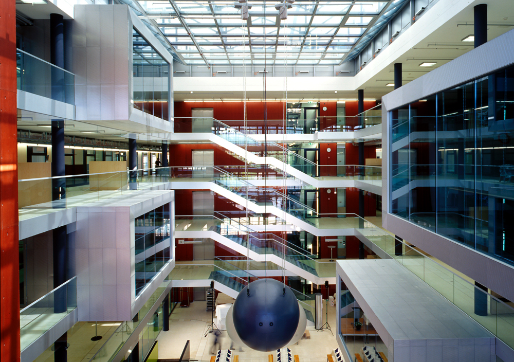 Da man von aussen nichts über das Innere erfährt, ist beim Eintritt die Überraschung gross: Es empfängt einen ein riesiges fünfgeschossiges Atrium. Es ist der kommunikative und haustechnische Kern des Gebäudes. Kommunikativ, weil es auch Ausstellungsraum ist und drumherum über alle Geschosse grosszügige Galerien mit offenen Besprechungs- und Arbeitsplätzen laufen. Haustechnisch, weil das Atrium Klimapuffer, unbeheizte Kühlzone sowie Licht- und Entlüftungskamin ist. Die automatischen Luken im Doppeldach unterstützen die Nachtauskühlung und Querlüftung. Die versetzte Anordnung der Sitzungszimmer bricht die Monumentalität des Luftraums. Nur der Vortragssaal, die Bibliothek, die Mediathek, die Seminarräume sowie einige wenige Büros auf der Nordseite sind nicht zweiseitig belichtet. Die meisten haustechnischen Anlagen sind offen geführt. Das hat zwar einen aufgeregten Materialmix zur Folge, doch so bleiben die Installationen jederzeit für die Wartung zugänglich.