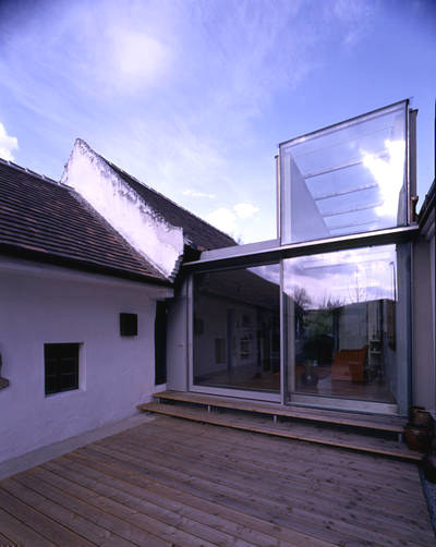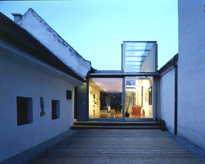 Das neue Volumen teilt den Hof in einen öffentlichen Galerie-Hof und in einen privaten Gartenhof. Beide Fassaden des Zubaus sind fast vollflächig verglast und ermöglichen die Blickbeziehung zwischen beiden Höfen. Der Zubau passt sich gekonnt in den Altbestand ein, das alte Bauernhaus bleibt als Körper erlebbar.