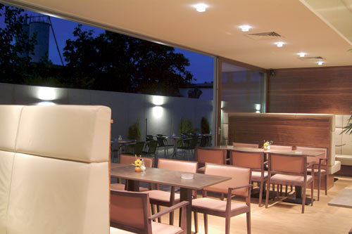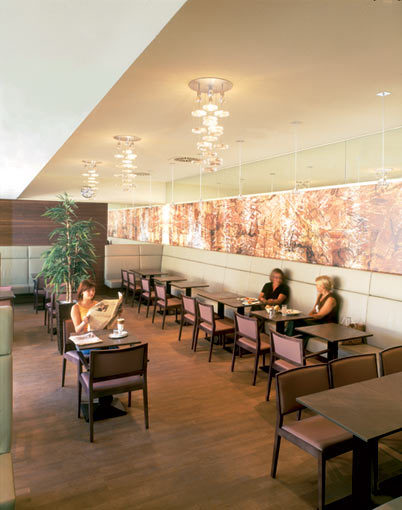 Der Kaffehaustypus verlangt die Abstinenz von kalten Farben. Spiegel erweitern den Raum und punktförmiges Licht in geschliffenem Glas verleihen Glanz und Festlichkeit. Patinafähige Materialien gestatten würdige Abnutzung und verleihen der Tradition Zukunft. Einzig das Wandkunstwerk Hans Wetzelsdorfers darf mit dem Kaffeehauskonzept brechen. Wohldosiert und unaufdringlich wird hier Kontrast und Lebendigkeit beigesteuert. Im Extrazimmer besteht die Möglichkeit Seminare und Veranstaltungen abzuhalten. Die 4-Sterne-Fremdenzimmer im Obergeschoss laden zu längerem Verweilen ein. (Text: Architekt)