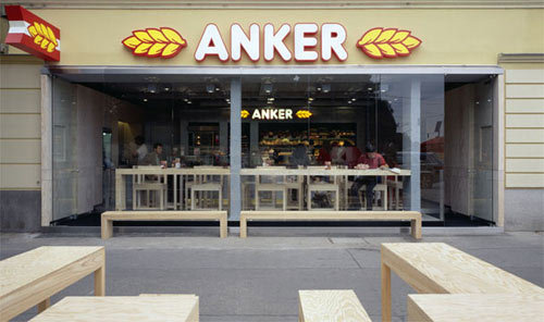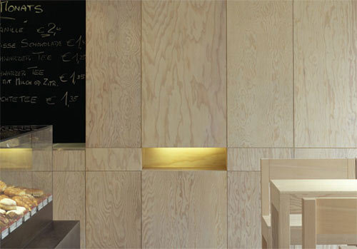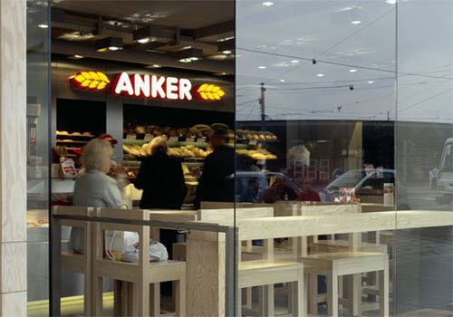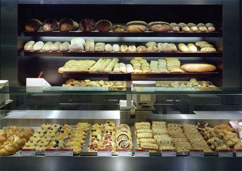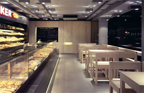 Die offene Decke mit frei abgehängter Lichtebene und ein sachlicher Betonboden sind unveränderbare Hintergrund-Hardware. Die relevanten architektonischen Eigenschaften sind Identifizierbarkeit, Solidität und Klarheit: Edelstahl als Warenträger betont die Back-Kompetenz. Alle Zubereitungsprozesse und Produkte sind hell ausgeleuchtet und für den Kunden transparent (gekürzter Text der Architekten).