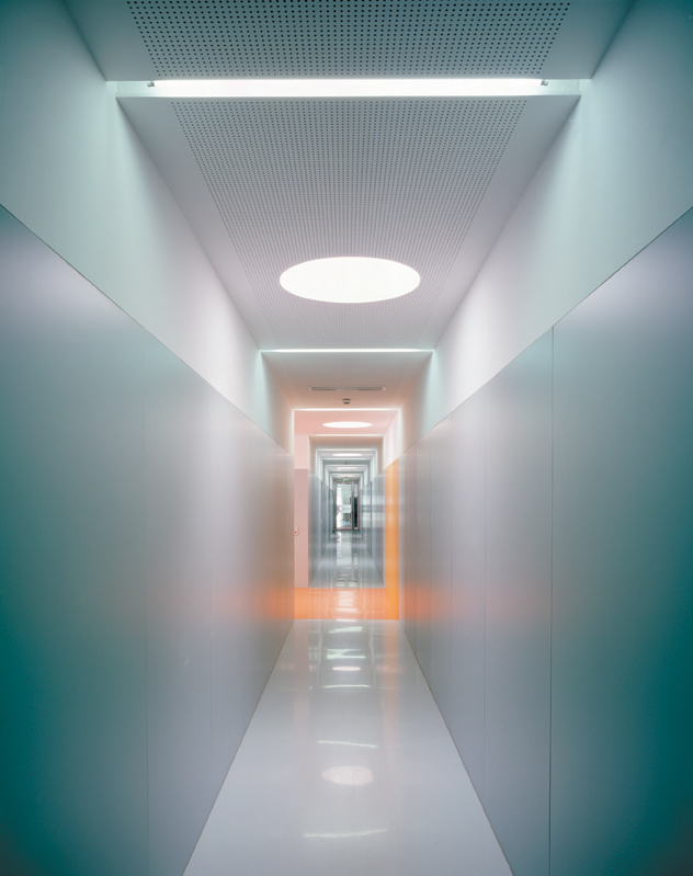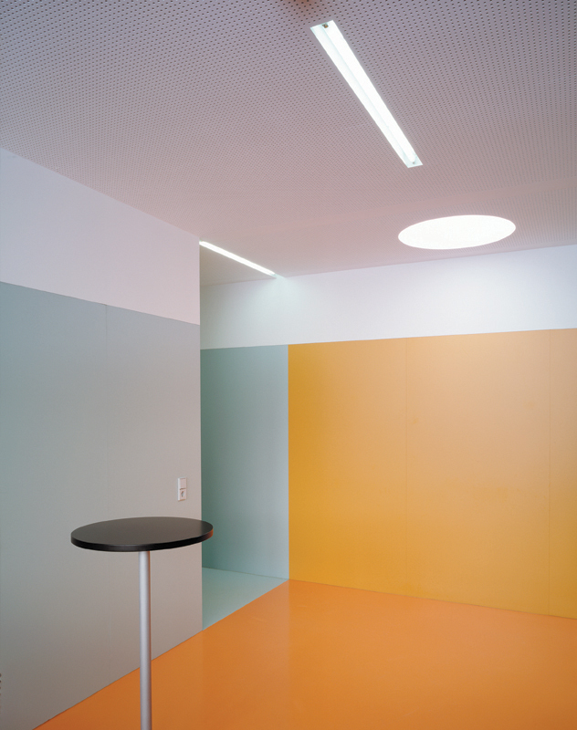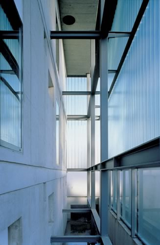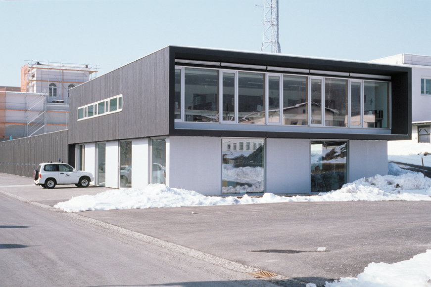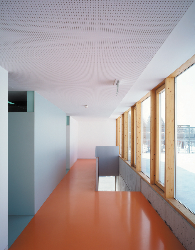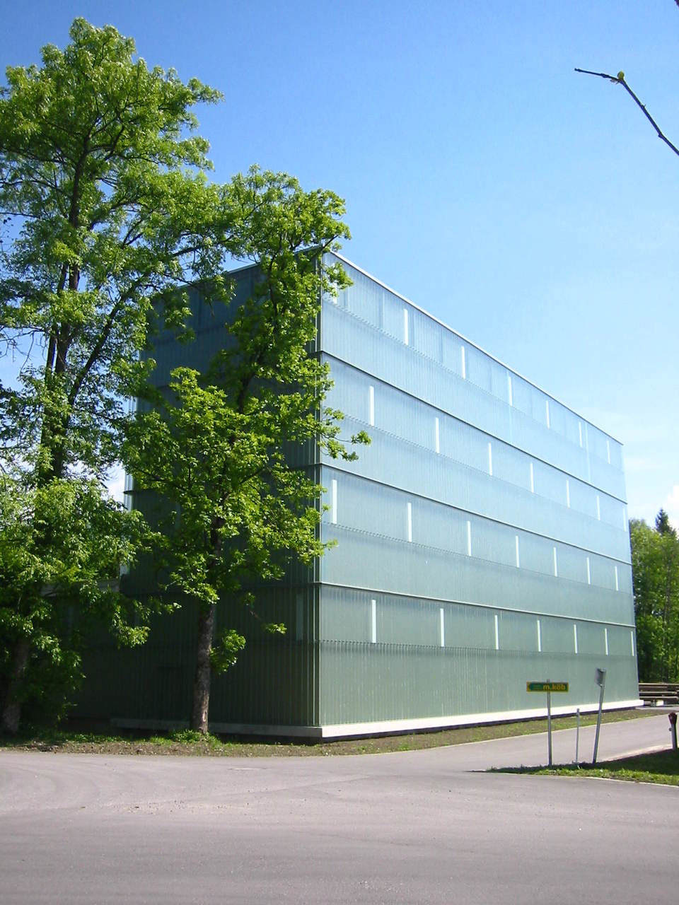 Im zweigeschossigen Teil befindet sich im Erdgeschoss eine Elektro-Werkstätte, im oberen Geschoss Büroräume. Die „Holzschachtel“ wird im zweigeschossigen Bereich vom Sockelgeschoss aus Stahlplatten und Glaselementen emporgehoben. Charakteristisch ist die Länge des Baukörpers, sein „Kopf“ orientiert sich ins Werksgelände.“ (Florian Semmler nach einem Text der Architekten)