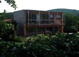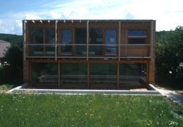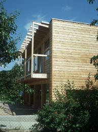 Für die Verschalung, die Decken und das geneigte Flachdach dient unbehandeltes Lärchenholz - mit der Eigenschaft, sich mit den Jahren in ein silbergrau zu verwandeln. Nach Süden öffnet sich das Haus im Erdgeschoss durch Vollverglasung, im Obergeschoss über eine die Hausbreite umfassende Balkonreihe dem Garten und dem Licht.