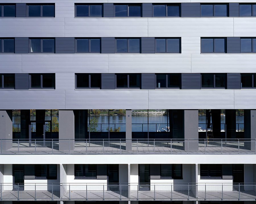 Auf den weiten Terrassen, die nieselregensicher unter einem Glasvordach ansetzen, breitet sich ein exklusives Panorama aus, das die Stadt von der Donaucity-Skyline bis hin zum Millenniumstower weiträumig umspannt. Mit unterschiedlich vorgesetzten Loggien, offenen Balkonen, und horizontalgeschlitzten Lochfassaden reagiert der Wohnbau auf sein Stadtumfeld, bewältigt souverän den Lärm und schafft auf verschiedenen Innenhofniveaus geschützte Grünflächen und eine durchgängige Anbindung zum umtriebigen Straßenraum des wild befahrenen Handelskais.