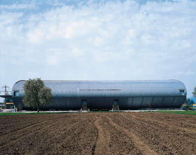 Eine flachgedeckte Halle sowohl auf einer Längs und einer Schmalseite beherbergen Eingangssituation, Umkleidekabinen und Lagerflächen. Diese heben sich sowohl in Material - Welleternit, Form und Gebäudehöhe gut von der bauchigen Halle ab, schließen aber anderseits an die angrenzende Messearchitektur an.