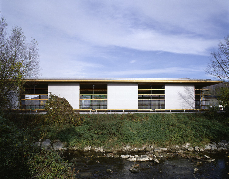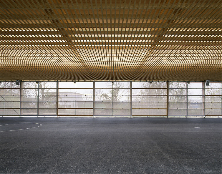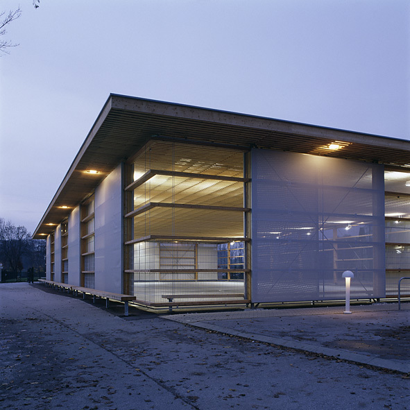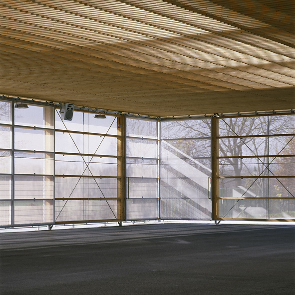 Die tatsächliche Höhe des Dachtragwerks bei der Querspannweite von 20 Metern ist hinter der rund eineinhalb Meter auskragenden Dachplatte kaum wahrnehmbar. Ein Holzlattenrost lässt ihre Untersicht homogen erscheinen. Die schwebende Wirkung des Daches fördern die statisch freigespielten Ecken und die Reduktion der Stützen auf 24 mal 24 Zentimeter. Diese Holz-Pendelstützen treten als tragende Elemente in den Hintergrund und wirken in die Wandstruktur integriert. Die drei der vier Außenwände mit Sonnenschutz-Elementen präsentieren sich im Duktus offener und geschlossener Flächen, wenn alle raumhohen Schieberahmen – wie manuell leicht möglich – geöffnet sind. Von innen erscheint die mit blaugrauem Polyestergewebe bespannte Hülle durchlässig, manchmal annähernd transparent, zum changierenden Raumeindruck trägt das zentrale Oberlichtfeld bei. Blendungen werden durch den Holzlattenrost als Deckenuntersicht vermieden. Die künstliche Belichtung erfolgt durch Strahler indirekt im Dachraum und direkt auf die Nutzfläche. Die reflektierenden Holzflächen tragen zur warmen Lichttemperatur bei.
