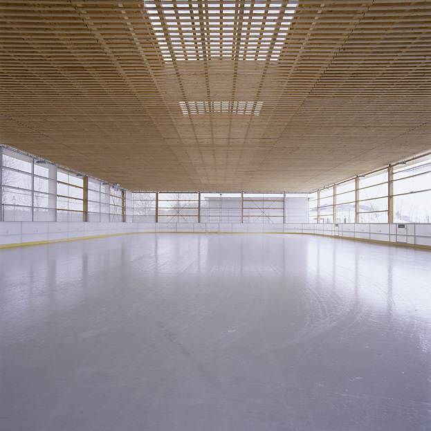 Die Eislaufplatz-Nutzung war entscheidend für die Wahl des wärmeträgen Materials Holz. Die Kondensatbildung wird durch die natürliche Durchlüftung der Konstruktionsteile bzw. des offenen Hallenraums verringert. Besonnung und abends Kunstlicht im Dachraum tragen dazu bei, dass die offene Holzkonstruktion möglichst trocken und schimmelfrei bleibt. Die sägeraue Behandlung der Deckenelemente aus Fichtenholz erhöht deren Sorptionsfähigkeit.
