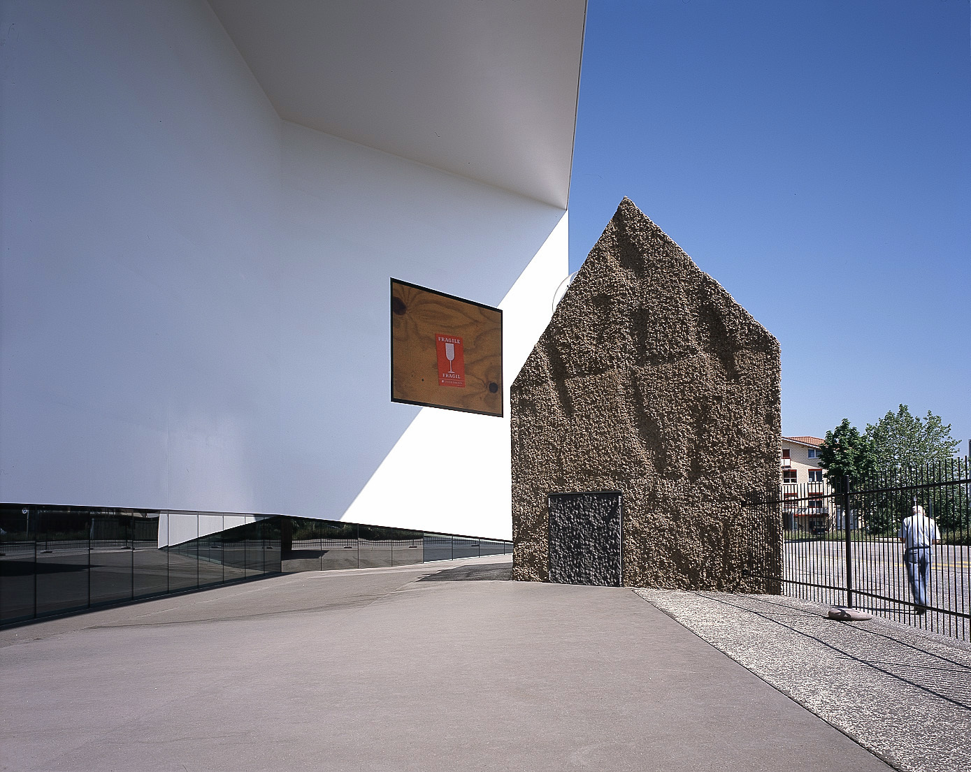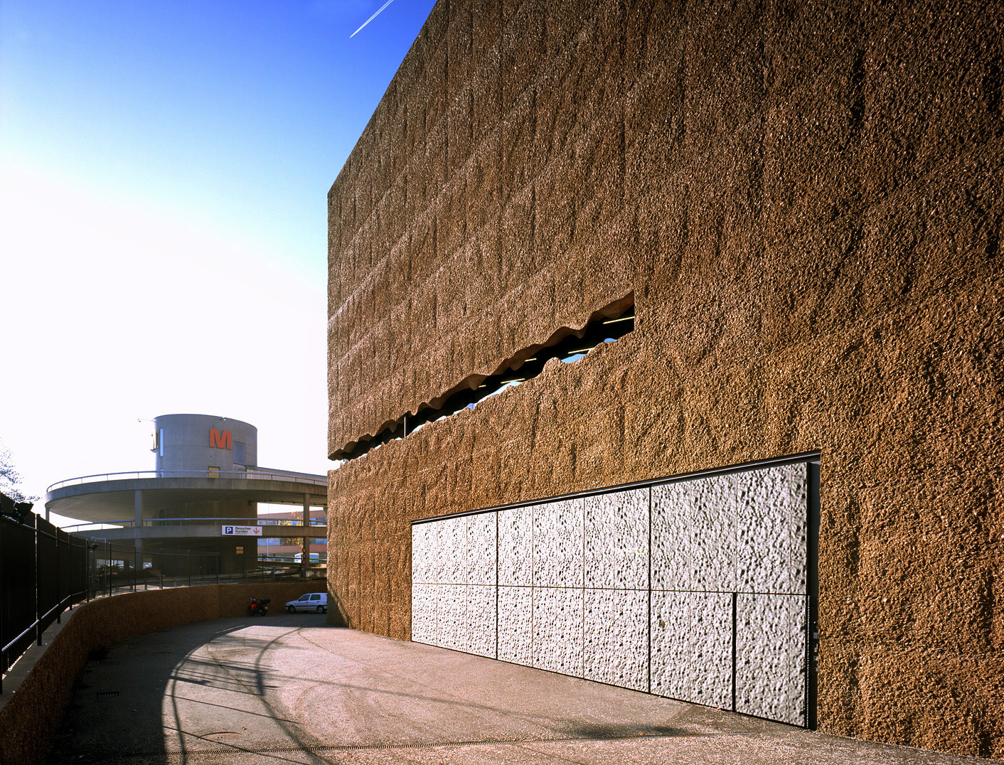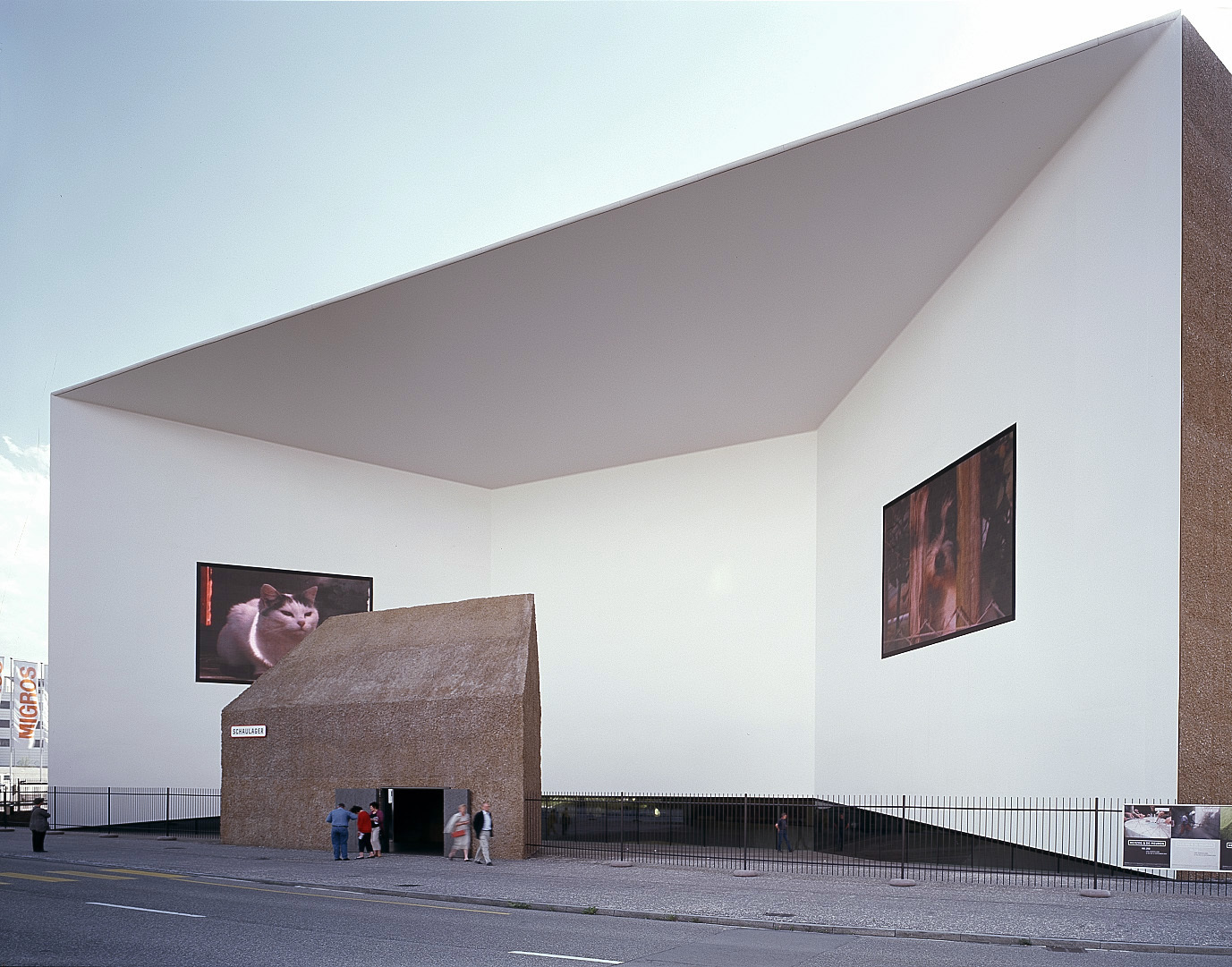 Eine Auffahrtsrampe schwingt sich zum Parkdeck des Migros-Verteilers. Von einem Verwaltungskomplex daneben prangt das Schild der Firma Spengler. Gegenüber hält das gelbe Elfer-Tram vor Einfamilienhäuschen aus den fünfziger Jahren. Dazwischen ragt ein Klotz in die Höhe, den man eher in den Wüstenstädten Arabiens erwartet. Die Fassaden sind so braun wie das steinige Feld daneben. Eine riesige Wand ist ohne jede Öffnung, andere haben kleine Türen oder schmale Fensterbänder, die mit ihren zackigen Rändern aussehen wie Papier, aus dem man Streifen herausgerissen hat. Der fünfeckige Grundriss macht das Gebäude nicht vertrauter. Taxifahrer reden vom Gefängnis und übersehen die subtile Schönheit des Fremdkörpers. Die Oberfläche der Fassade ist aufgeraut und schimmert aus der Ferne wie feiner Samt im blauen Frühlingshimmel, als schütze sich das Gebäude mit einem schweren Kleid gegen das trostlose Umland an der Stadtgrenze zwischen Münchenstein und Basel. Zur Tramhaltestelle hin öffnet es sich jedoch mit einer eingeschnittenen Wand in strahlendem Weiss, aus der zwei grosse LED-Flächen mit Bildern von der Kunst im Innern herausleuchten. Wer hier aussteigt, fühlt sich eingeladen, näherzutreten und das kleine Häuschen zu passieren, das in die Einbuchtung gesetzt ist und städtebaulich eine Brücke zu den Siedlungshäusern schlägt. «Schaulager» heisst das neue Haus, nach ihm wurde die Tramhalte-stelle umbenannt. Hier finden die Kunstschätze der Emanuel-Hoffmann-Stiftung ihr neues Domizil, soweit sie nicht in den Öffentlichen Kunstsammlungen Basel ausgestellt sind.