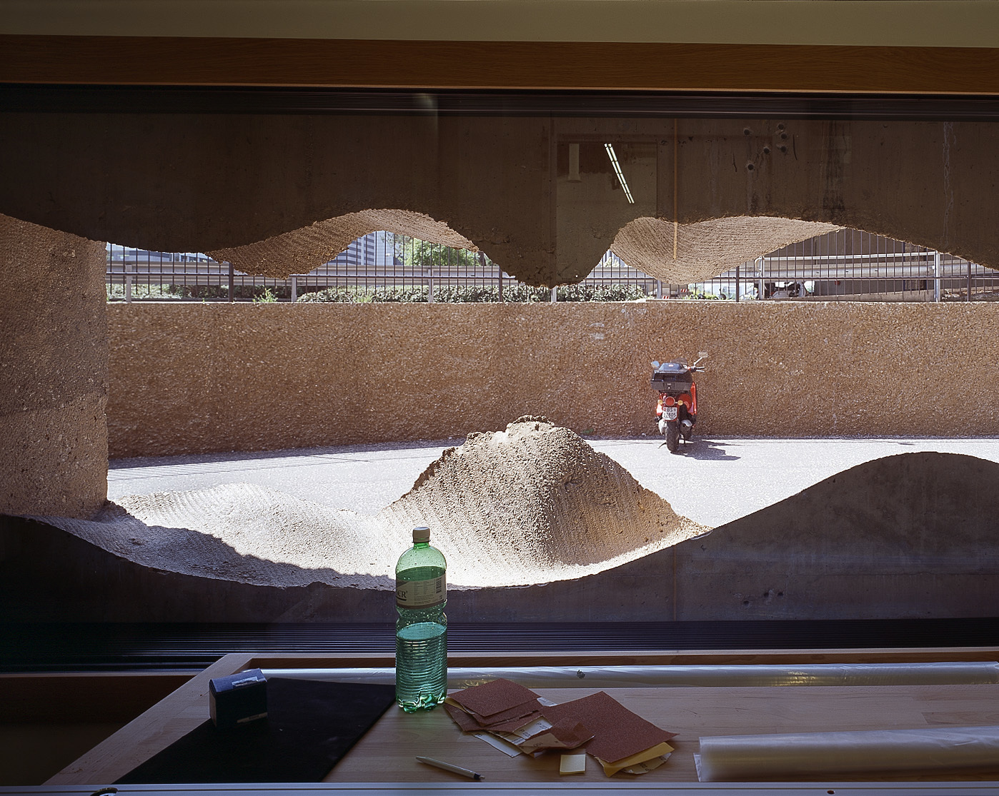Die Oberfläche der Fassade zieht sich wie ein Leitmotiv durchs Gebäude. Die Stahlbleche, die den Eingang von Verwaltung und Anlieferung verkleiden, haben ihre gewellte Form direkt von der rauen Oberfläche des Betons: ein Bleichblech wurde mit einem Hammer in der Art einer Frottage abgedrückt, eingescannt und gefräst. Das Panel, das man so gewonnen hat, kehrt im Auditorium, das für wissenschaftliche Vorträge bereitsteht, als Wandverkleidung wieder, die mit der violetten Bestuhlung eine aparte Atmosphäre schafft. Die beiden Fensterbänder fressen sich wie millionenfach vergrösserte Risse durch den Beton der Fassade und legen sich mit ihren Stegen und Wellungen dem Blick von innen wie eigene Landschaften vor die Umgebung; technisch wurde ein kleiner Kupferzylinder zusammengedrückt und in Beton abgerollt, die entstehende Form ist am Computer bearbeitet.