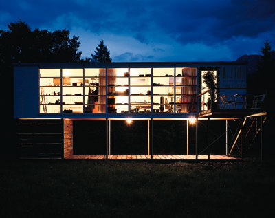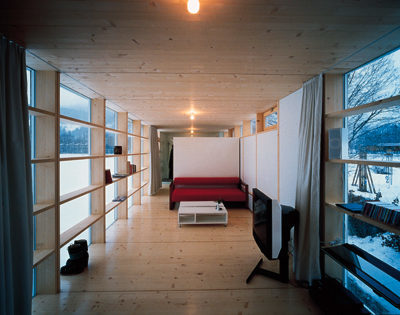 Das Innere des Hauses, die 43 m², können variiert werden, Trennwände eingezogen, die Holzoberflächen gestaltet werden. Das ganze Haus wird von einer Pfosten-Riegel-Konstruktion getragen. Funktional durchdachter Nebeneffekt ist die raumhohe Verglasung einer Längsseite. Die dahinter stehende Tragkonstruktion dient so gleichzeitig als durchgehendes Regalsystem.