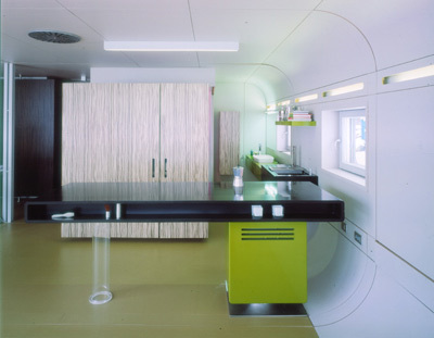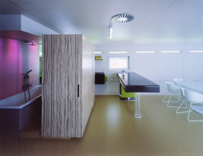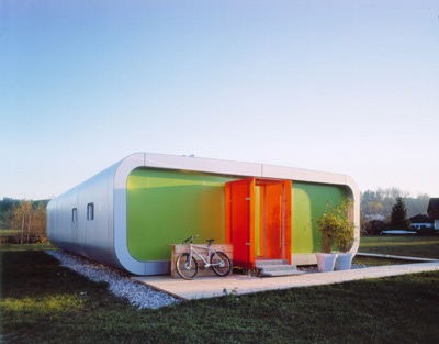 Keck ragt der Windfang aus orangen Kunststoffwabenscheiben, einem Nebenprodukt der Skiindustrie, aus der silbernen Alucobond-Fassade, die sich wie ein Neoprenanzug um die C-profilierte Hauskarosserie legt. Aerodynamisch schmiegt sich der Boden zur glasgeschlitzten Rückwand und Decke, fließend öffnet sich der Raum auf drei Nurglas-Seiten zur Terrasse. Das Interieur designte Peham selbst: Schränke auf Rädern, Schiebeelemente, die auf-/wegklappbare Küchenbox u. Ä. machen aus spaci- gen Möbeln multifunktionale Raumteiler und lassen so auf 77 m² mehr als genug Luft.
