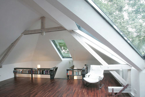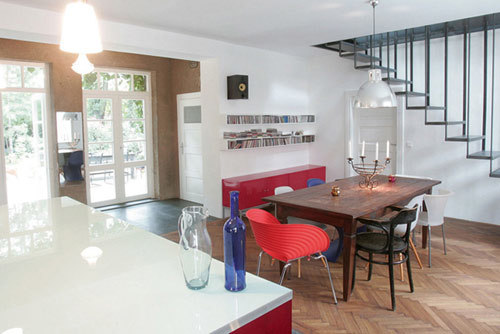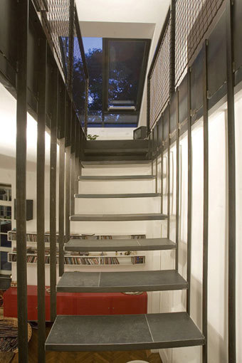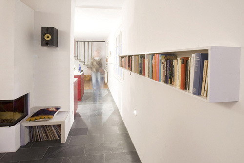 Auf diese Weise entstanden zwei großzügige Einheiten, die sich jeweils auf zwei Ebenen erstrecken. Im ehemaligen, zur Straße hin ebenerdigen Keller wurden Büroräumlichkeiten untergebracht, die separat vom Straßenniveau zu begehen sind. Der äußerlich burgähnliche Charakter, betont durch eine Runderker, und die mächtige 3 Meter hohe Mauer, die das Grundstück einfasst, stehen im spannenden Kontrast zum luftigen und hellen Innenleben des Gebäudes. (Text: Architekten)