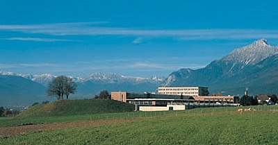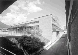 Für Schlögl, respektive seine Landesberufsschule für das Bau- und Malergewerbe, bildete dieser Bau mit seinen spezifischen Themen jedenfalls genauso wie die Landschaft eine Vorgabe. Schlögl respektierte beides. Vom Tal aus betrachtet, verdoppelt sich jetzt der horizontale, langgestreckte Bauteil, er fügt sich ein, indem er die Grenze zwischen den ansteigenden Wiesen und dem Bergmassiv dahinter markiert. Der auffällige Quertrakt erhielt so ein adäquates „leises“ Gegengewicht, das bis zu einer auffälligen Hügelkuppe mit drei Bäumen reicht. Diese künstlich erscheinende, trotzdem natürliche Topographie faßt den gesamten Bau im Osten. Schlögl verwendete zwar wieder ein langgestrecktes Volumen mit Bandfenstern, dennoch präsentiert sich der Neubau mit den dezent rötlichvioletten Betonsteinen ungleich eleganter als der ältere Bau. Und er ist durchgehend horizontal organisiert, wobei diese Geste in schwebende Dächer und Vordächer ausläuft.