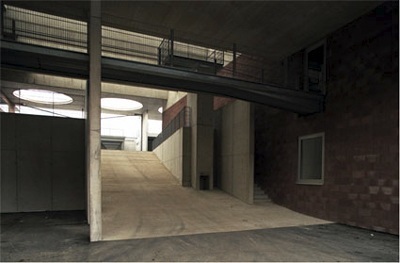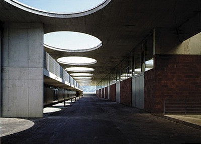 Eingefaßt von Alt- und Neubau sowie der prägnanten Hügelkuppe, öffnet sich dieser Bereich nach Süden, ist geschützt und frei zugleich und profitiert vom schönen Baumbestand. Ähnlich selbstverständlich wie diese Freiräume wirkt die Gliederung des gesamten Baus. Nur der Eingangstrakt steht quer zum Hang, die übrigen Funktionen sind – beginnend mit dem Längstrakt –parallel hintereinander gestaffelt, und die Erschließung erfolgt zum Teil in weiten Schleifen. Ins Auge sticht die offene Anlieferungszone für den Bauhoftrakt, wo in die horizontale Dachfläche große, runde Öffnungen geschnitten sind. Diese weitausgreifende Dachfläche definiert das Gebäude innerhalb des Winkels, und sie referiert zwei architektonische Topoi: das Schweben sowie die Fläche als selbständiges Element.