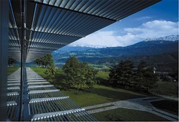 Was die Moderne programmatisch formulierte, findet man hier pragmatisch umgesetzt, und beides spielt in der aktuellen Architekturentwicklung in unterschiedlichster Weise eine Rolle. Schlögl variiert diese Themen bei den Vordächern und den südseitigen Sonnenschutzlamellen, die in ihrer strukturellen Auflösung zur Prägnanz der langen Fassade beitragen. Zusätzlich greifen – ähnlich wie beim Altenheim in Unterperfuss – vertikale Flächen vom Baukörper in die Umgebung, sie begrenzen eine Treppe oder Parkplätze und binden gleichzeitig die Landschaft an.
