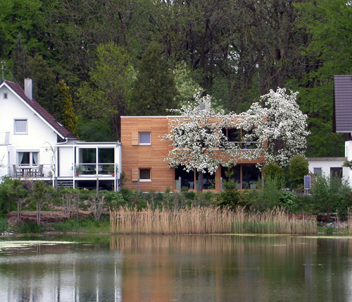 Die zum See hin orientierten Wohnräume sind bis auf die Schlafzimmer durch fließende Übergänge gegliedert, wobei die zentrale, innenliegende Küche mittels Schiebetüren vom Eingangs- und Wohnbereich abgetrennt werden kann. (Text: Architekten)
