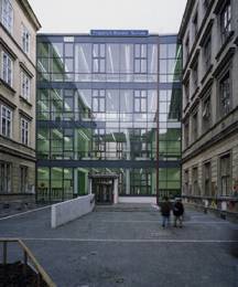 Die Schule, die er im 2. Bezirk nun gebaut hat, ist von der Strasse aus nicht zu sehen. Sie verbindet zwei zueinander parallel stehende Bauten, ein Gymnasium und eine Hauptschule, beide aus der Gründerzeit.