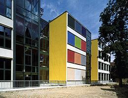 Der Blick in den Hof dahinter läßt die angrenzenden Wohnbauten erkennen. In diesem 2. Hof hat Gerngross sowohl mit Farben als auch Formen gearbeitet. Die Fassade hat hier Einschnitte erhalten, was einerseits die Klassenräume als Blöcke hervorhebt, andererseits durch die Rücksprünge den Blick auf den Gang und durch ihn hindurch wieder in den Haupthof gestattet.
