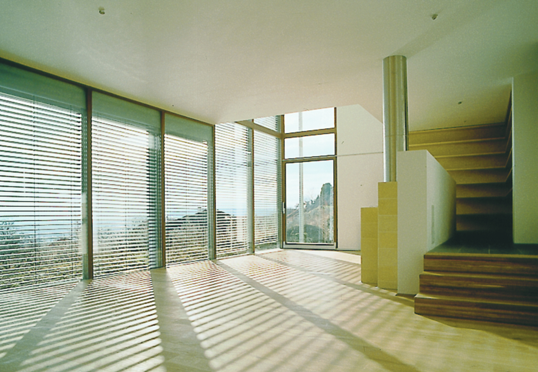 The structure is composed of three segments with different functions: a low structure situated at the front with the entry area, sanitary facilities and the garage; a vertical unit that functions as a joint and houses the stair case and the gallery; a north-south oriented, long main building, parallel to the slope that contains a living/dining area, a kitchen and a guest room on the first floor and bedrooms on the second floor.