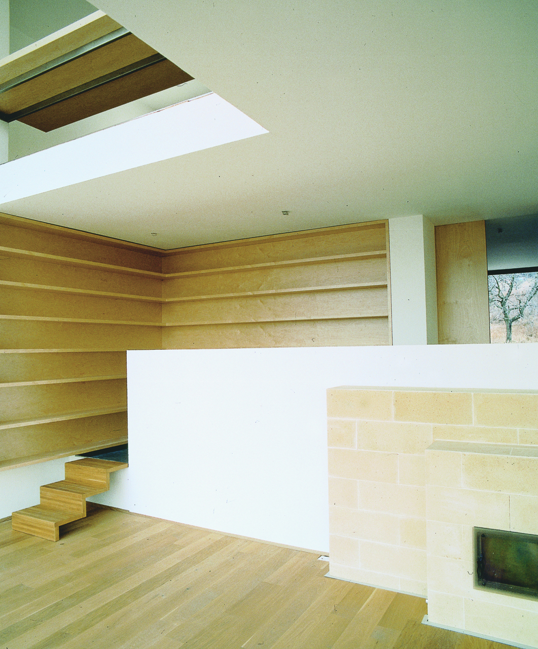 The modified assemblage of these elements results in a structure that responds to the local topography at the same time as it mirrors the residents’ needs and incorporates the use of passive solar energy. The openings in the two walls that form the outer hull of the house are defined by the location, the residents’ habits and the possible vistas of the mountain and into the valley. The flow of rooms inside is dependent on and influenced by their specific use and circulation.