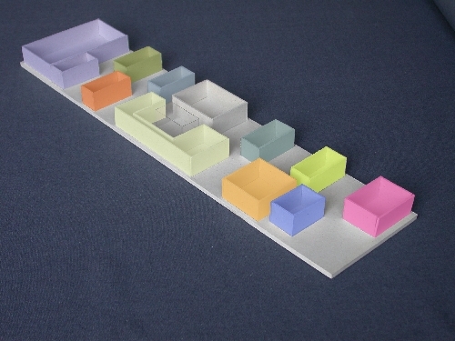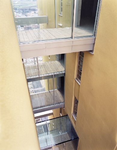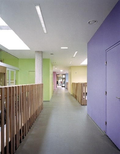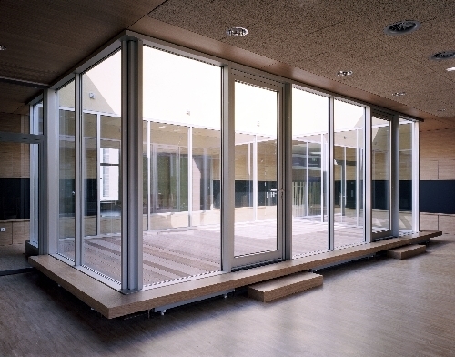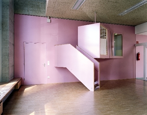 In Reaktion auf die Monotonie der Fensterreihen im umgebenden Quartier, ist das Thema der Wandöffnung das prägende und verbindende Gestaltungselement des Stadtteilzentrums. Ein großzügiges Grundmodul von 2,10 x 2,10 m wird horizontal oder vertikal addiert, je nach Nutzung unterschiedlich variiert und nimmt die unterschiedlichsten Positionen ein: Als zweigeschossige Öffnung im Bereich der Wohnungen, als stehende oder liegende, großzügige Öffnung für die öffentlichen Bereiche oder als Oberlicht bzw. als modulares Prinzip für eine spezifische Gestaltung des Flachdachs.