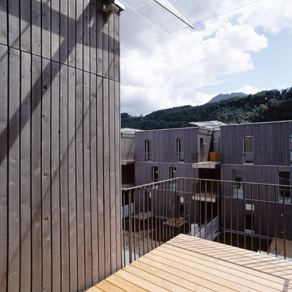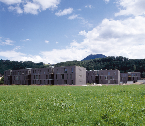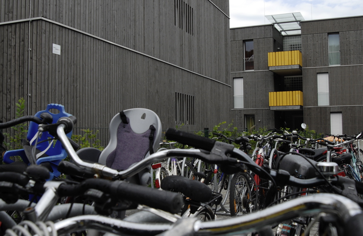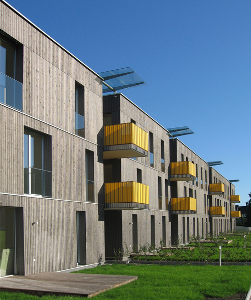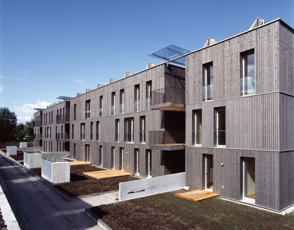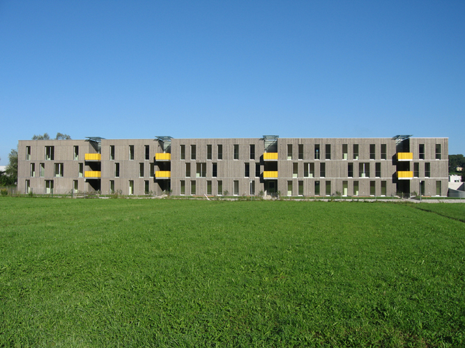 Die Verwendung von Beton beschränkt sich auf Fundament bzw. Keller sowie die Stiegengerippe: Auf einer Ortbetonscheibe liegen die Podeste auf, dazwischen werden die vorgefertigten Stiegenläufe eingehängt. Ansonsten wurden die Bauten ausschließlich in Holzbauweise errichtet, selbst die brandbeständig auszubildenden Wände zwischen Wohnungen und Stiegenhäusern. Holzbau Meiberger fertigte die Decken aus Kreuzlagenholzplatten und knapp 8000 Quadratmeter Holzriegelwände vor, die in zehn Wochen montiert wurden. Der Anspruch an Nachhaltigkeit, Ökologie, Ressourcen schonendes Bauen und Energieeffizienz beschränkte sich nicht auf den Einsatz von Holz als nachwachsenden, CO2-neutralen Rohstoff. Geringe Bodenversiegelung zeichnet die Anlage mit Gründächern und Regenwassernutzung aus, die natürlich belüftete Tiefgarage erhielt Oberlichten. Mit Zellulose gedämmte, atmungsaktive Außenwände, geölte Holzböden, Holz-Alufenster und Holzterrassen im Erdgeschoß tragen ebenfalls zum hohen Wohnkomfort bei.