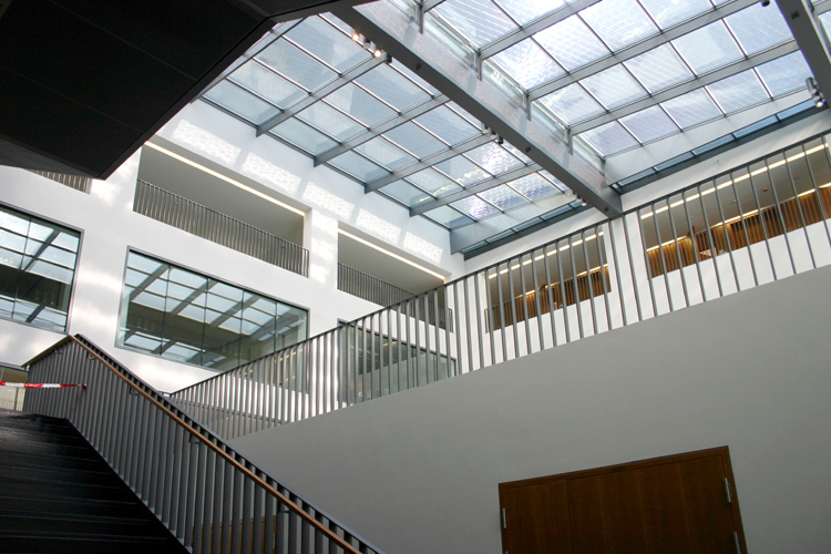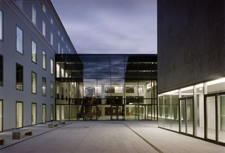 Ein steinerner Solitär steht am Eingang. Ihm gegenüber flankiert der ehemalige Primogeniturpalast den zur Stadt geöffneten Vorplatz und begleitet ins Gebäude. Die Universität empfängt nun ihre Besucher in einer großzügig gestalteten gläsernen Halle. Eine Freitreppe führt zu den Institutsbereichen, offene Laubengänge dienen als attraktive Aufenthaltsfläche und sorgen für eine gute Orientierung.