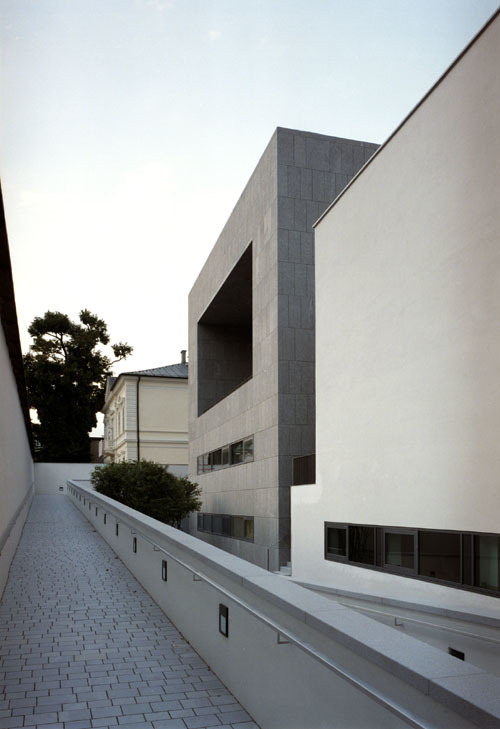 Die lichte gläserne Architektur der Eingangshalle steht im Kontrast zum steinernen, in sich ruhenden Solitär. Seine Präsenz in der Stadt macht ihn zum neuen Markenzeichen der Universität Mozarteum. Innen gelangt man über seitliche Aufgänge vom Foyer in den neuen Kammermusiksaal, der über eine Loggia zum Mirabellgarten und damit zur Stadt geöffnet ist. Stelen lösen die Wände auf, Licht tritt gefiltert ein, Aufgang und Konzertsaal wirken räumlich und akustisch zusammen. Stein und Holz definieren den Raum und bieten einen besonderen Rahmen für musikalische Erlebnisse.