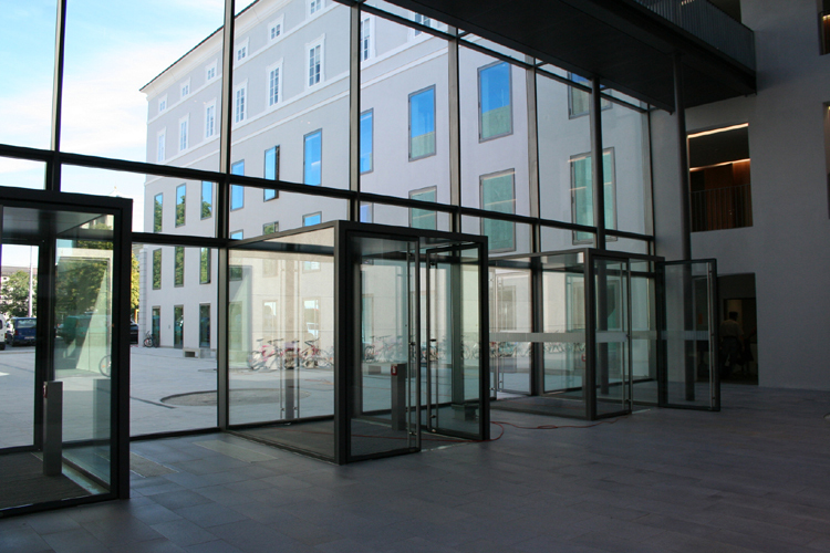 Städtebaulich konnte durch den Rückbau ganzer Gebäudeteile der bestehende Komplex geöffnet werden. Es entstand ein Entree, das den Ansprüchen einer Universität entspricht. Gliederung und Kubaturen nehmen den Maßstab der Umgebung auf. Der Stadtraum Mirabellplatz wird in das Gebäude hineingeführt. Im Gegenzug öffnet sich das neue Haus zur Stadt. Öffentlicher, halböffentlicher und universitärer Raum kommunizieren miteinander bis in den Mirabellgarten.
