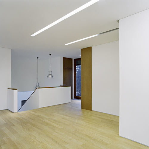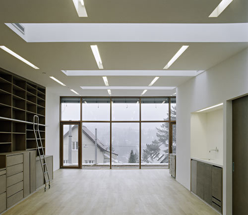 Aktuell ist das Atelierhaus einzig auf die Bedürfnisse des Malers zugeschnitten: Werkstatt, Ausstellungsraum und Arbeitsatelier bieten die ideale Arbeitsumgebung. Die Hanglage (das Gelände fällt Richtung Norden ab) bedingt, dass man das Haus unter Erdgeschossniveau betritt und zum Ausstellungsraum hinaufsteigt. Dieser ist im Erdgeschoss von der Straße weg, zum Garten hin orientiert.