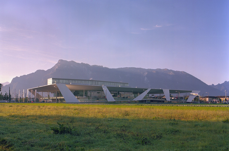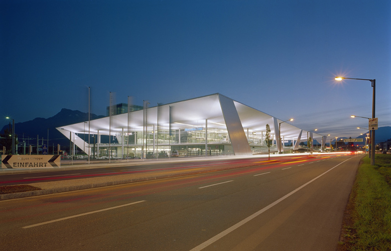Die neue Konzernzentrale der Pappas-Gruppe am Salzburger Flughafen ist ein bemerkenswertes Beispiel für diesen Trend. Das durchaus konservative „Familienunternehmen mit 2000 Beschäftigten“ hat sich hier ein Gebäude geleistet, in dem unterschiedliche Funktionen auf insgesamt 36.000 Quadratmeter Nutzfläche übereinander gestapelt sind. Auf der untersten Ebene befindet sich eine KFZ-Werkstätte, darüber eine Verkaufszone für die verschiedenen Marken des Daimler-Chrysler-Konzerns. Über diesem breit gelagerten Baukörper liegt ein schmälerer, zweigeschoßiger Verwaltungstrakt. Wie immer, wenn bei einem Verkaufsgebäude mehrere Geschoße übereinander liegen, stellte sich auch hier die Aufgabe, die Kunden nach oben zu locken. Erschwerend war in diesem Fall die erforderliche Geschoßhöhe der KFZ-Werkstätte, die bis zur Verkaufsebene einen Höhensprung von sechs Metern zu überwinden vorgab.